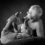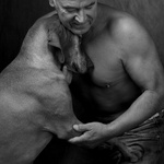 2008Relatie mens en dier, Man en hond, staand, verterend, zwartwit
