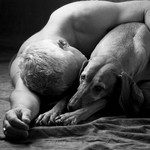 2008Relatie mens en dier, Man en hond liggend, zwartwit